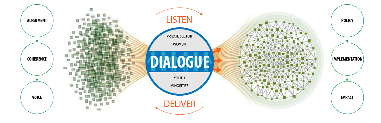 Democratic fabric is the structure of relationships, processes and communications that enable civil society to play a productive role in democratic governance and development. The ability to operate a healthy democracy depends on the engagement and trust between citizens and government. With democratic fabric frustration and cynicism are expressed through productive engagement. When citizens are not heard and basic needs are not met, frustration can turn into demonstration and violence.